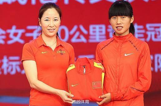 发布会上,2000年悉尼奥运会女子20公里竞走冠军王丽萍(左)将代表中国田径荣誉的国家队战袍转交给本届参赛选手刘庆红(右)。王丽萍与刘庆红之间的交接,是老一代运动员与年轻运动员之间的交接,是专业选手与大众选手之间的传递,是国家田径队开启新篇章的神圣时刻。